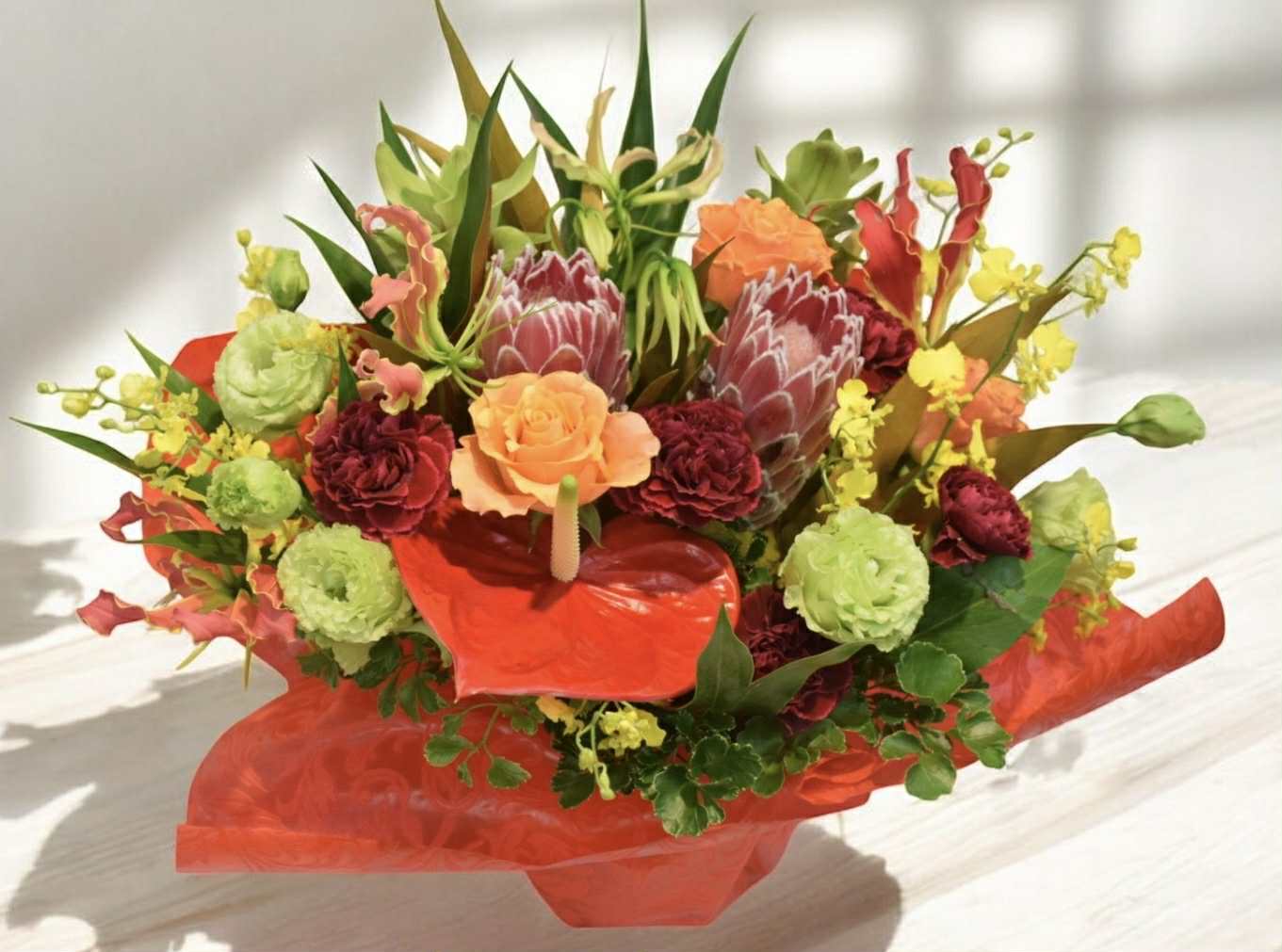 厳選された新鮮なプロテアなどの珍しい花を使い、その美しさを際立てています。色とりどりの花々が生み出す華やかさと共に、祝いの気持ちをしっかりとお届けします。